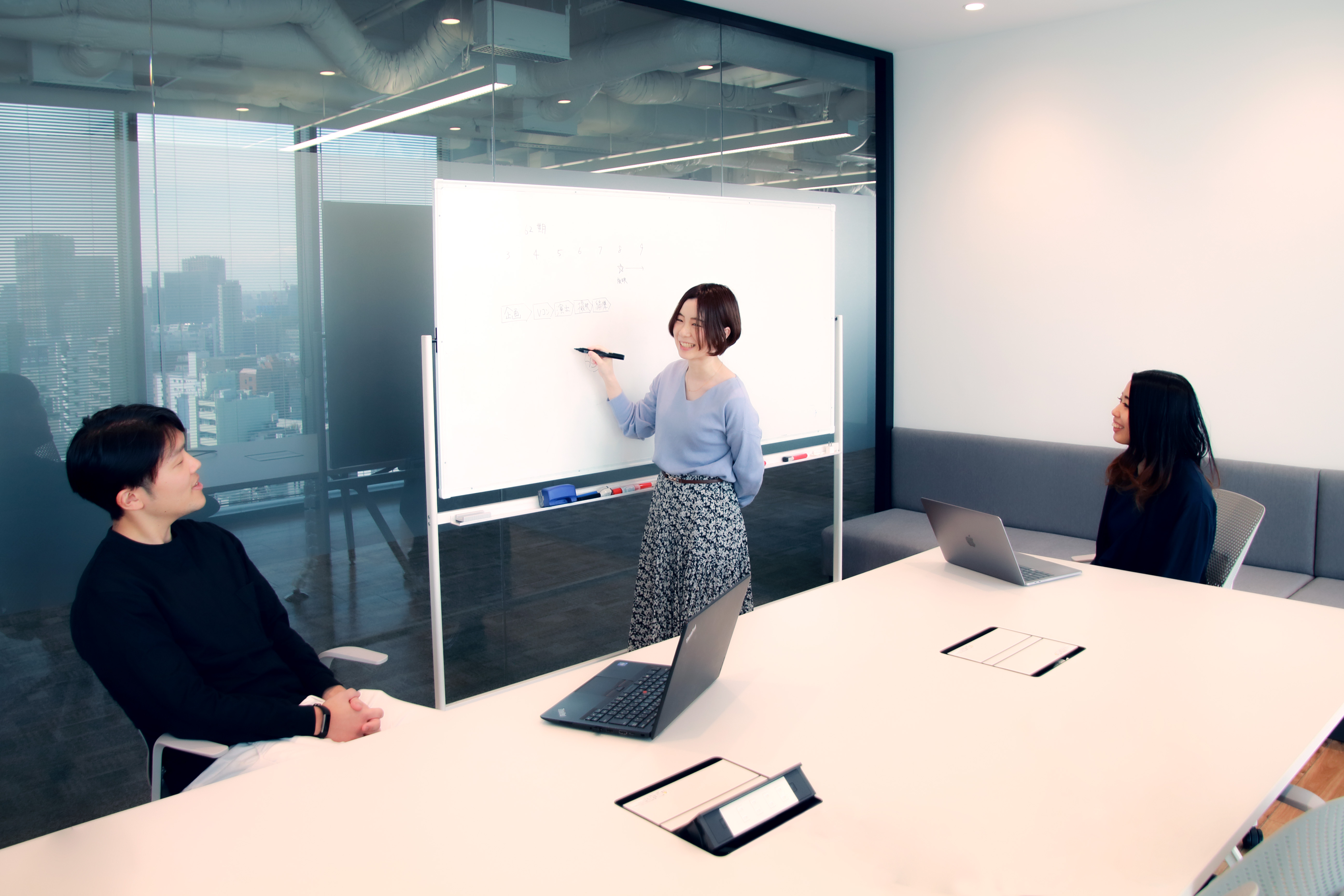 奥田: 進藤さんがプロジェクトリーダーのような形で中心となっています。(本居)綾さんはシニアアートディレクターとして制作面でのリーダーとなっています。社内では3人チームとして、社外を含めると代理店さんとワンチームで一緒にCMを作っています。
